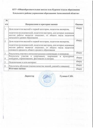 На основании вышеизложенного экспертная комиссия делает заключение: КГУ «Общеобразовательная школа села Курское отдела образования по Есильскому району управления образования Акмолинской области» располагает необходимым учебно-педагогическим потенциалом и квалифицированным педагогическим коллективом для организации учебно-воспитательного процесса на современном уровне, имеет достаточную материально-техническую базу, в целом соответствующему статусу общеобразовательной школы.